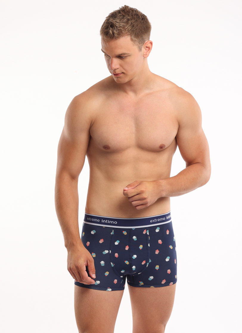 Muške bokserice u teget boji sa dezenom kolačića i natpisom Extremeintimo na lastišu deo su kolekcije Kolekcijski basic. Izrađene su većinski od najfinijeg pamuka premium kvaliteta što ih čini veoma prijatnim i udobnim za nošenje, a mali dodatak elastina ih čini rastegljivim i lako prilagodljivim svim građama. Visina modela je 186 cm. Model nosi veličinu 4 (52).