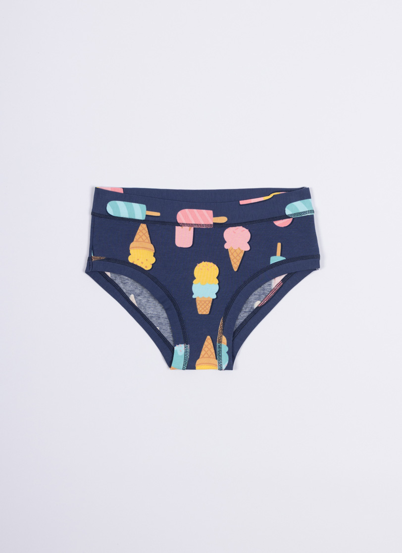 Dečiji slip u teget boji za devojčice sa dezenom sa sladoledima deo je Ice Cream kolekcije. Izrađen je sa većinskim udelom pamuka i veoma malim dodatkom elastina, koji je vešu podario optimalnu udobnost i prijanjanje bez žuljanja tokom aktivnosti. Lako se kombinuje sa drugim modelima iz iste kolekcije. Cena artikla zavisi od veličine koju izaberete.
